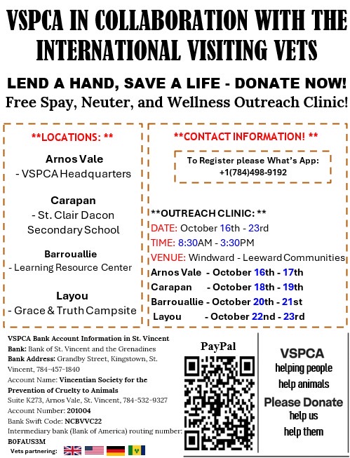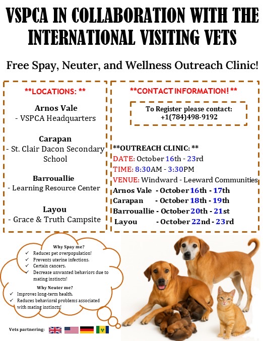 The VSPCA, in partnership with international visiting veterinarians, will host a free spay, neuter, and wellness outreach clinic for communities across St. Vincent from October 16th – 23rd, 2025. All pet owners are invited to register early to ensure their animals receive care during the clinic week.